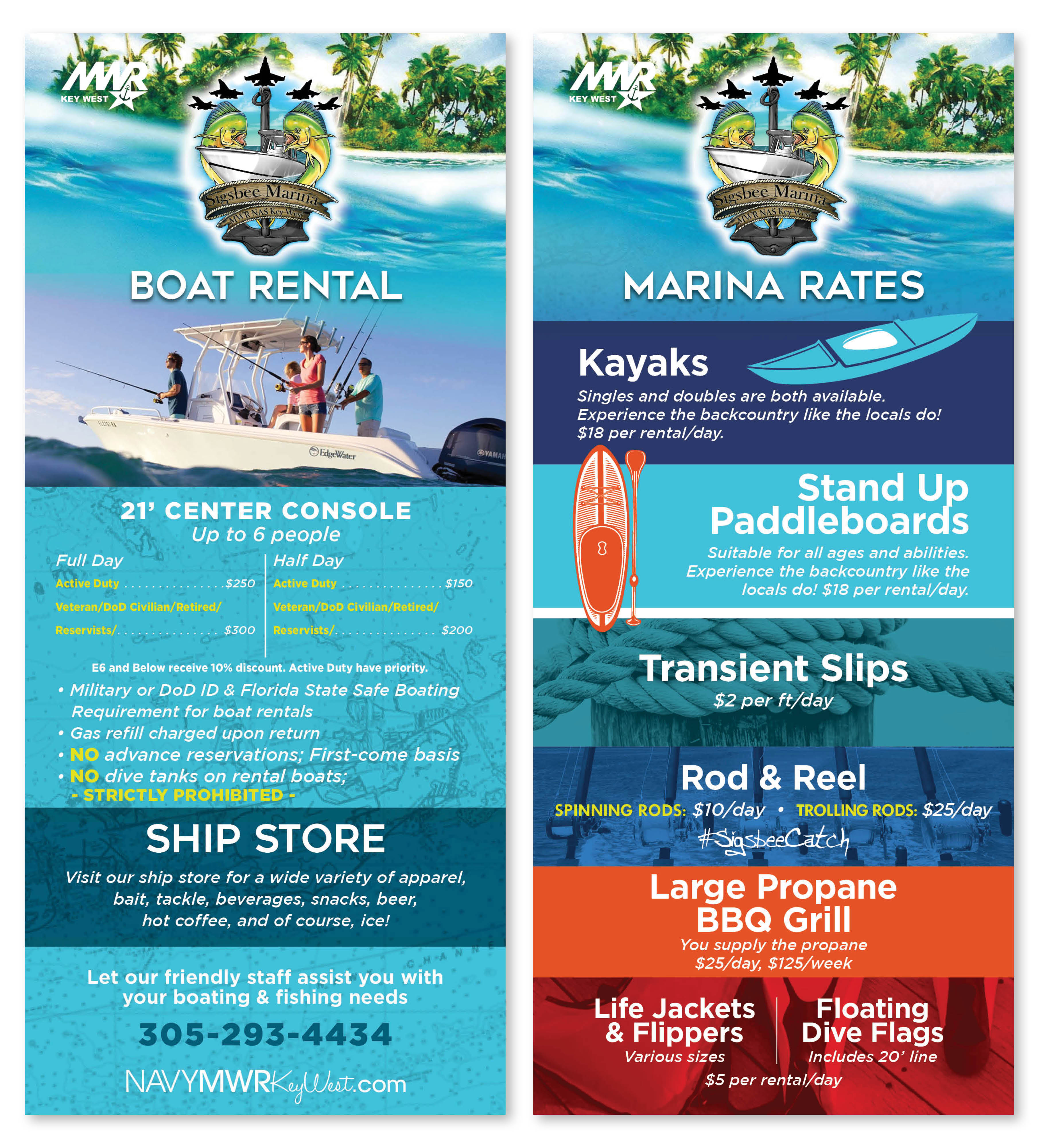 Sigsbee Marina, located on Dredgers Key in Sigsbee Park on the North side of Key West offers everything you need to get out on the waters of Key West. The ship store provides fuel, bait, ice, tackle and gear rentals: kayaks, stand up paddle boards, snorkeling fins (mask & snorkel are available for purchase only), fishing rods and reels and large propane BBQ grills. The marina also rents a 21' Center Console fishing boat. Florida State safe boating card required for eligibility of power boat rentals and there is a gas refill charged upon return. Rentals are on a first-come, first-serve basis and dive tanks are not permitted onboard the rental boats. Marina transient wet slips available - insurance and registration of vessels DoD owner is required.