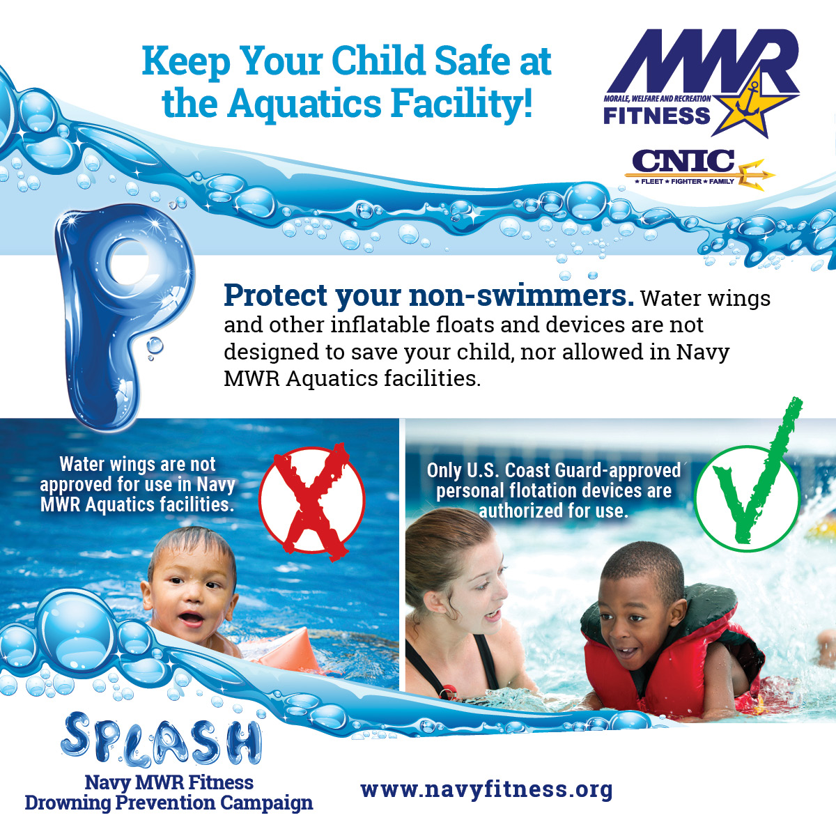 Protect your non-swimmers. Water wings and other inflatable floats and devices are not designed to save your child, nor allowed in Navy MWR Aquatics facilities.