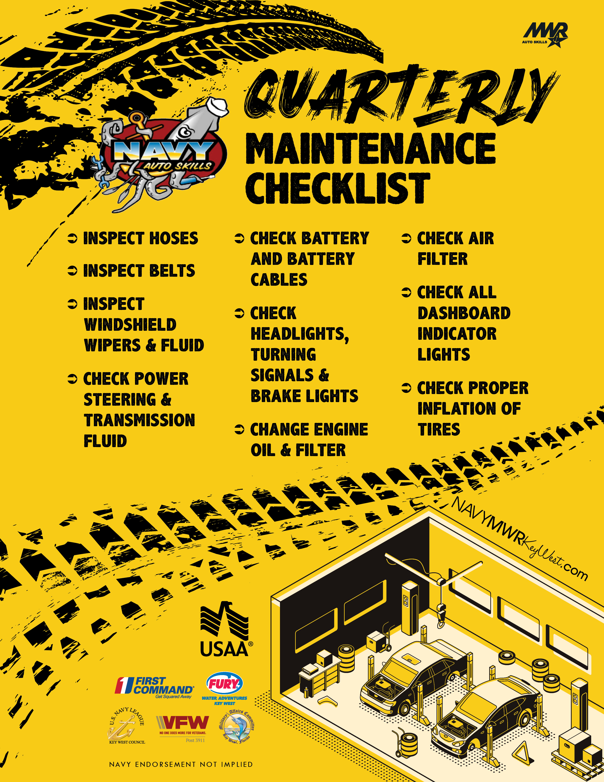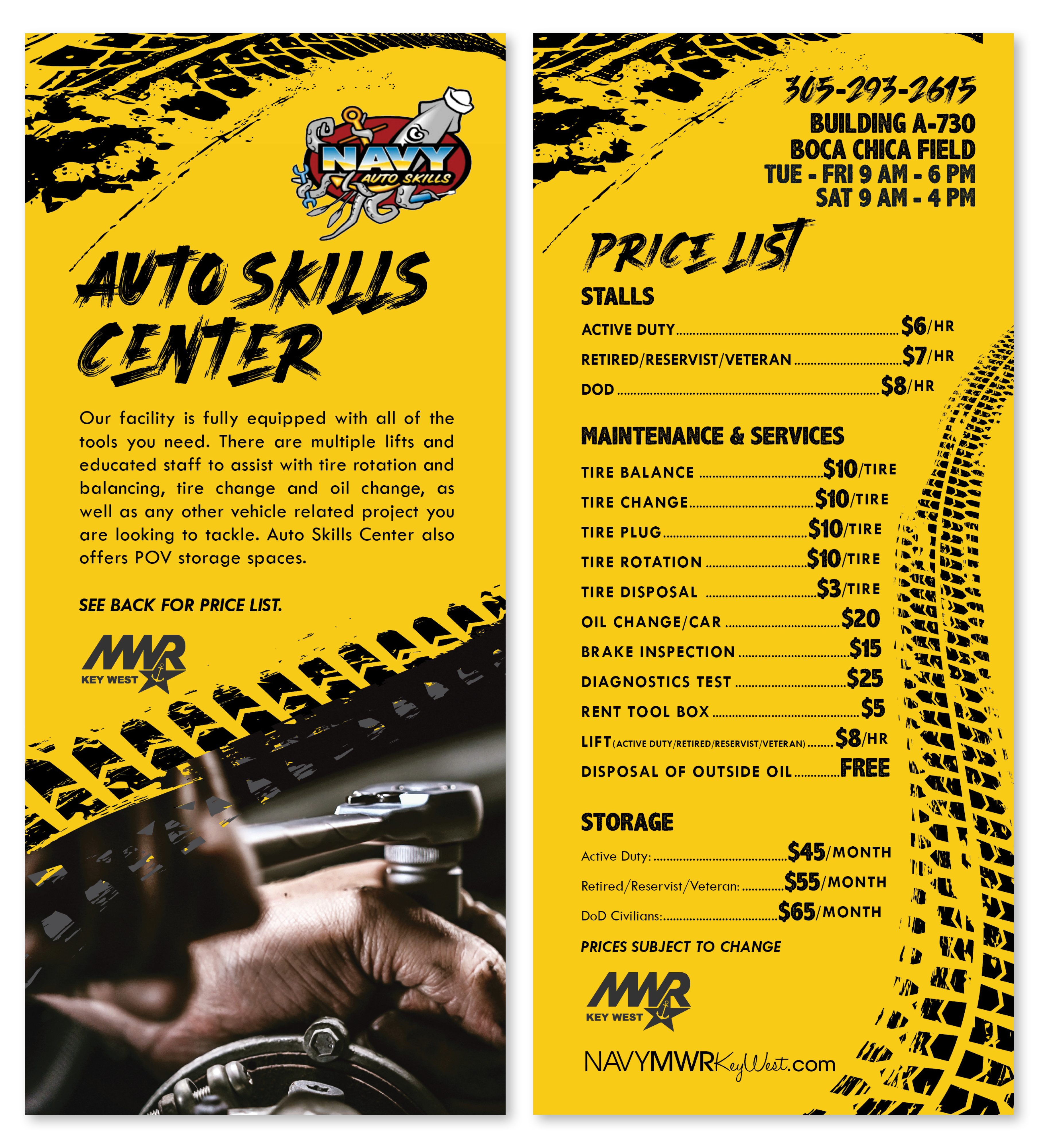 Auto Skills Center, located on Boca Chica Field, offers a clean and professional facility fully equipped with the all of the tools you need. There are multiple lifts and educated staff to assist with tire rotation and balancing, tire change and oil change, as well as any other vehicle related project you are looking to tackle. Auto Skills Center also offers POV storage spaces.