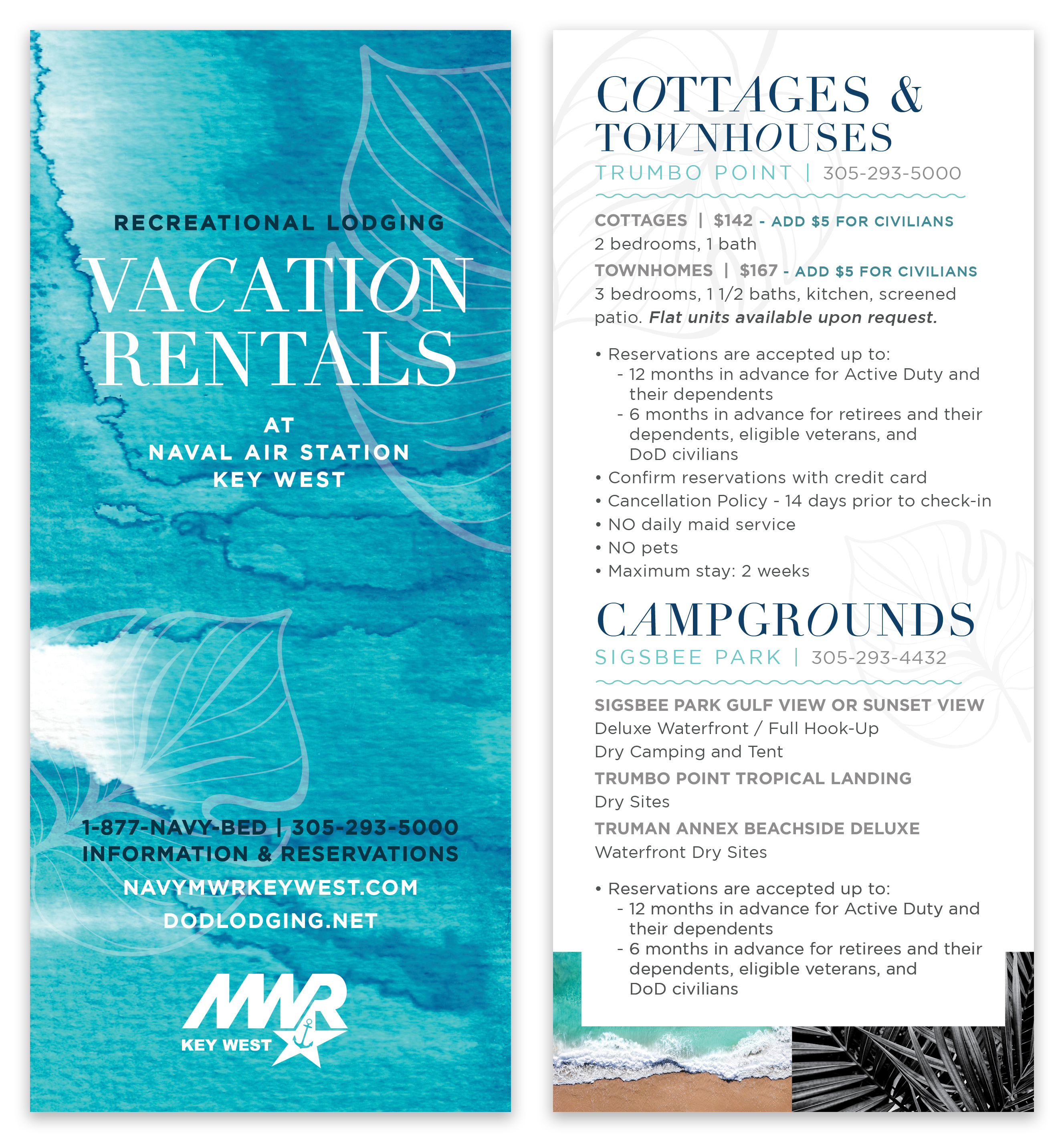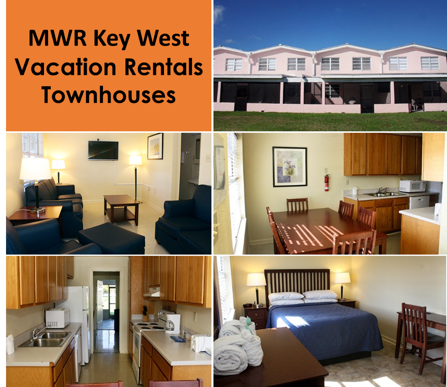 Recreational Lodging Vacation Rentals, located on Trumbo Point, provides the best quality and value in lodging for leisure travel to Key West. Vacation Rentals offers 3 bedroom/1.5 bathroom townhouses as well as 2 bedroom/1 bathroom cottages. Each unit is fully furnished and includes cable TV. Active duty, their dependents, and reservists can make reservations 1 year in advance starting at 8 AM EST on the first of the month. Retired military, their dependents, eligible veterans, DoD civilians and retired DoD civilians can make reservations 6 months in advance starting at 8 AM EST on the first of the month. Reservations may be made by calling the local office, calling 877-Navy-Bed or by going online to www.DoDLodging.net.